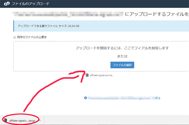 そのためには「このファイルの移動先となるファイルパスを入力します」の下に表示されるボックスに表示されている、ドメイン以降のURLを削除します(赤く囲ってある箇所)。このブログの場合だと「public_html/affiliate-signal.com/この先のURLを全部削除します」。