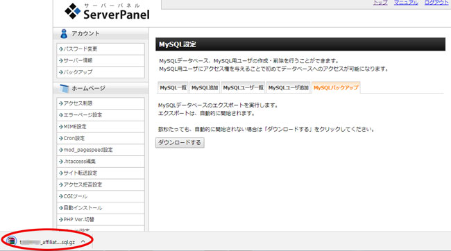 3、エックスサーバーでmysqlファイルをダウンロードする